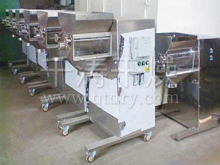 本機(jī)是一種將攪拌好的潮濕粉末混合物料,在旋轉(zhuǎn)滾筒的正反旋轉(zhuǎn)作用下,借由滾筒表面的三角棒推動(dòng)物料強(qiáng)制性通過篩網(wǎng)或孔板,從而制成所需尺寸的顆粒,或?qū)K狀物料打散成小顆粒。也可以利用此原理對(duì)帶式干燥機(jī)進(jìn)行均勻布料。